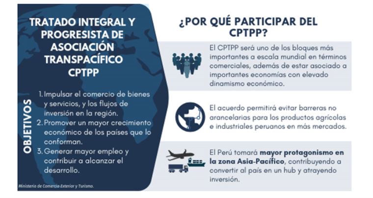 El CPTPP, por sus siglas en inglés, permitirá impulsar las exportaciones peruanas, sobre todo las no tradicionales, que tienen valor agregado, además de posicionar estratégicamente al Perú dentro de la región de Asia Pacífico, según destacó en un comunicado el ministro de Comercio Exterior y Turismo (Mincetur), Roberto Sánchez.